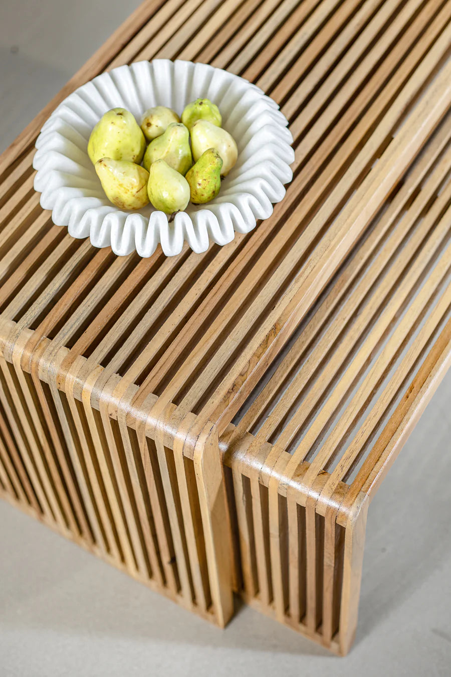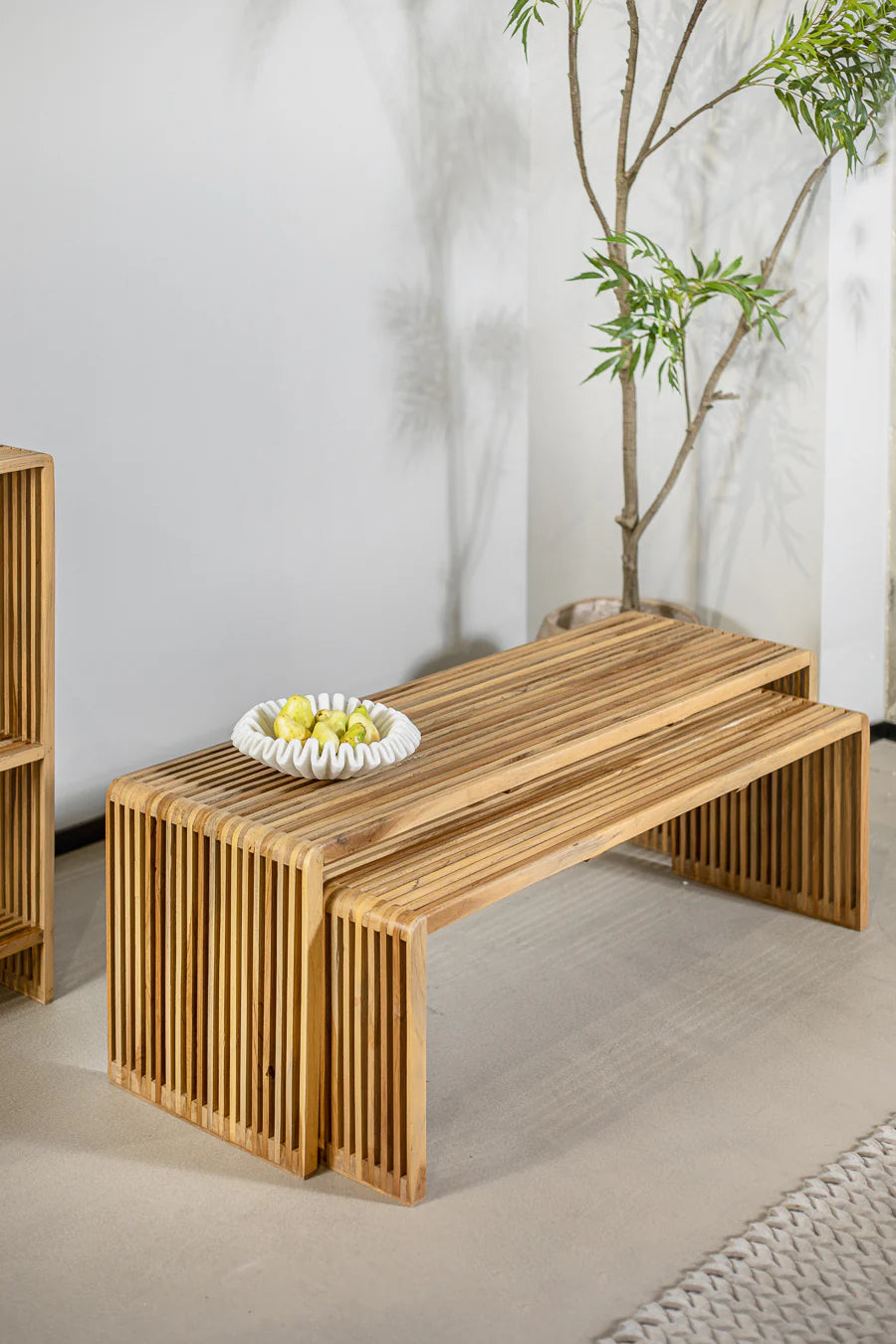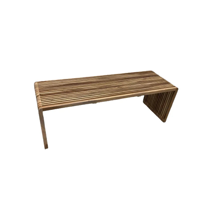 ספסל ריזורט בגוון עץ טיק. ספסל עץ טיק מעוצב פסי עץ מכופפים בגימור שיקי.